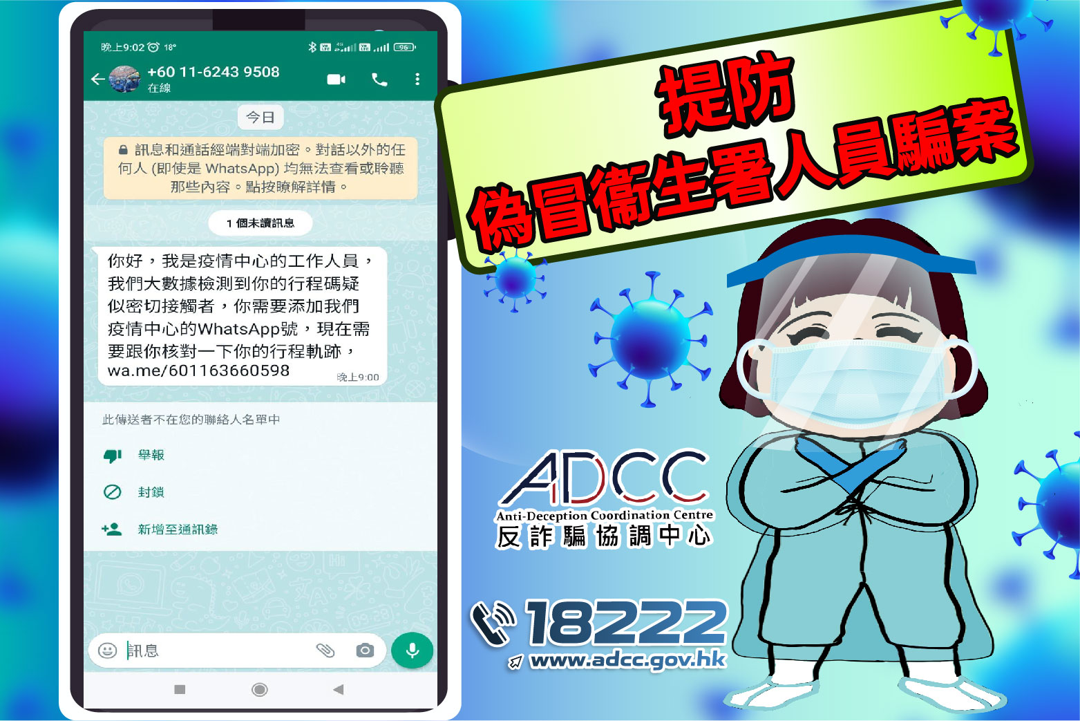 Recently, members of the public have received WhatsApp messages from scammers impersonating staff of the Centre for Health Protection. They claimed that the recipients have been identified as suspected close contacts from their travel codes screened by big data, and asked the recipients to add them on WhatsApp for verification.