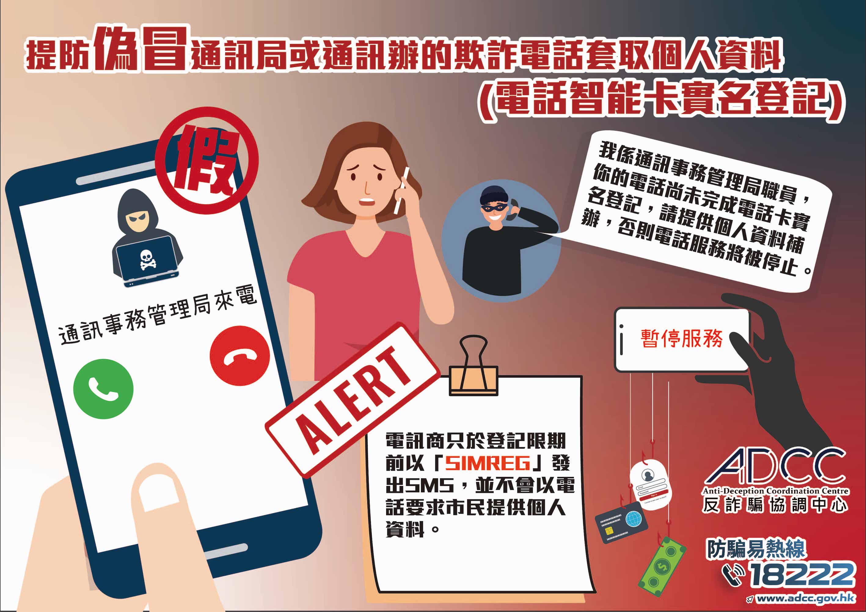 Recently, there are scammers impersonating staff from the Communications Authority (CA) or the Office of the Communications Authority (OFCA) and calling the public. The calls were made in the form of pre-recorded message or by a real person claiming that as the recipients had failed to complete real-name registrations for their SIM cards, their telephone services would be suspended unless they provided personal information for the callers to complete the real-name registration for them.