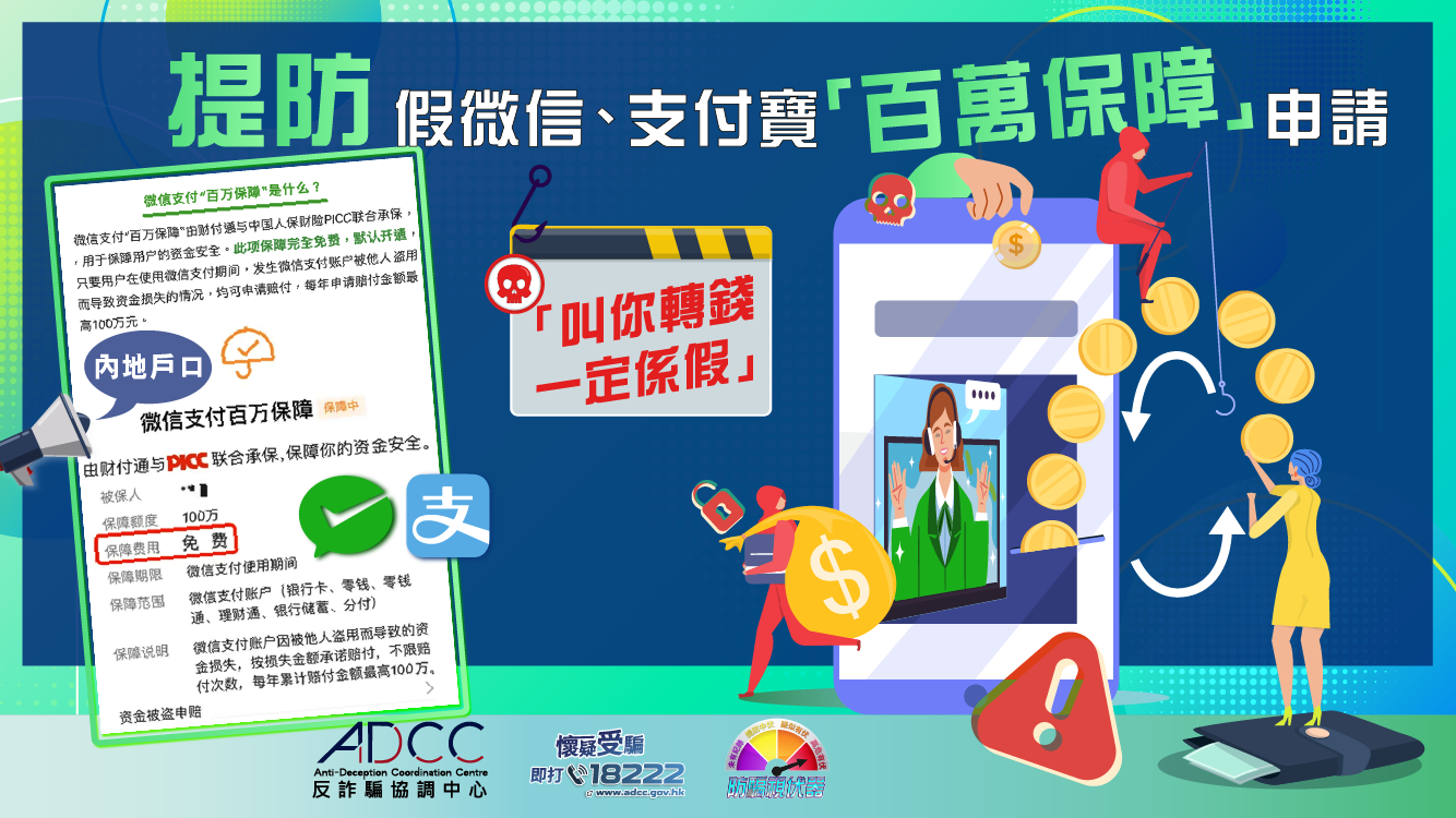 Recently, the Police have received reports from members of the public about calls from scammers claiming themselves as customer service staff of WeChat or Alipay. They lured the victims to pay money to apply for “million dollar guarantee” service, or falsely claimed that the victims’ payment accounts had activated such service and fees will be deducted every month should cancellation not be requested, or claimed that such service was about to expire and payment was required for renewal, otherwise the victims’ credit ratings would be affected.