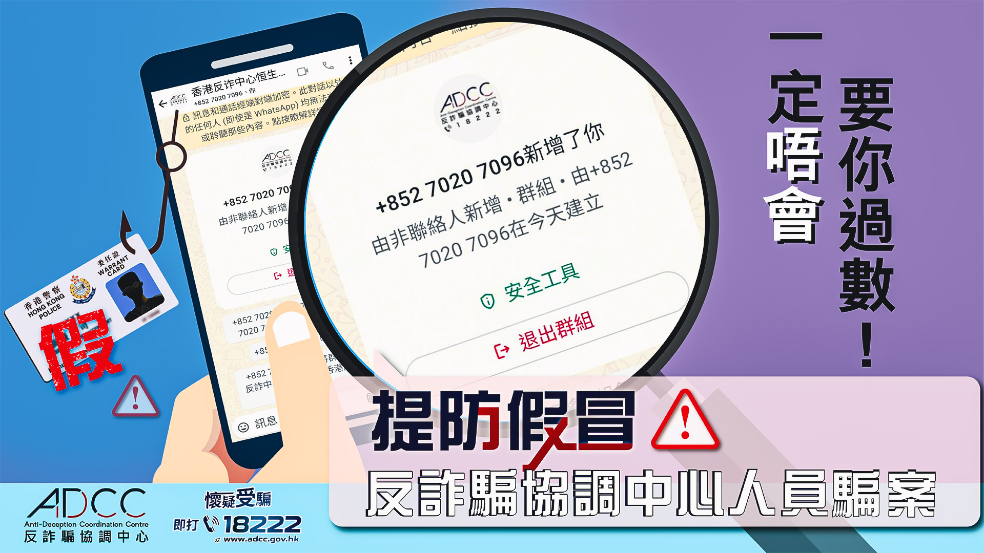Recently, scammers impersonating officers of the Anti-Deception Coordination Centre (ADCC) of the Hong Kong Police Force sent WhatsApp messages with phone number +852 7020 7096 to members of the public, falsely claiming that they were involved in illegal activities such as money laundering, and requesting them to provide their bank account transaction records, personal and bank account information so as to assist in investigation.