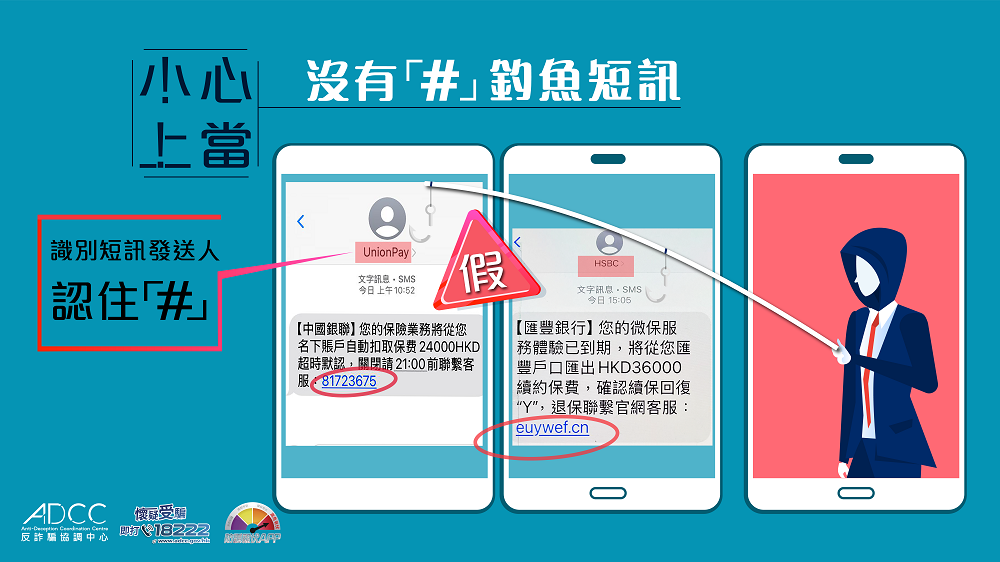 The sender IDs of SMSs sent by Hongkong and Shanghai Banking Corporation Limited and UnionPay International begin with “#”. They are “#HSBC” and “#UnionPay” respectively;