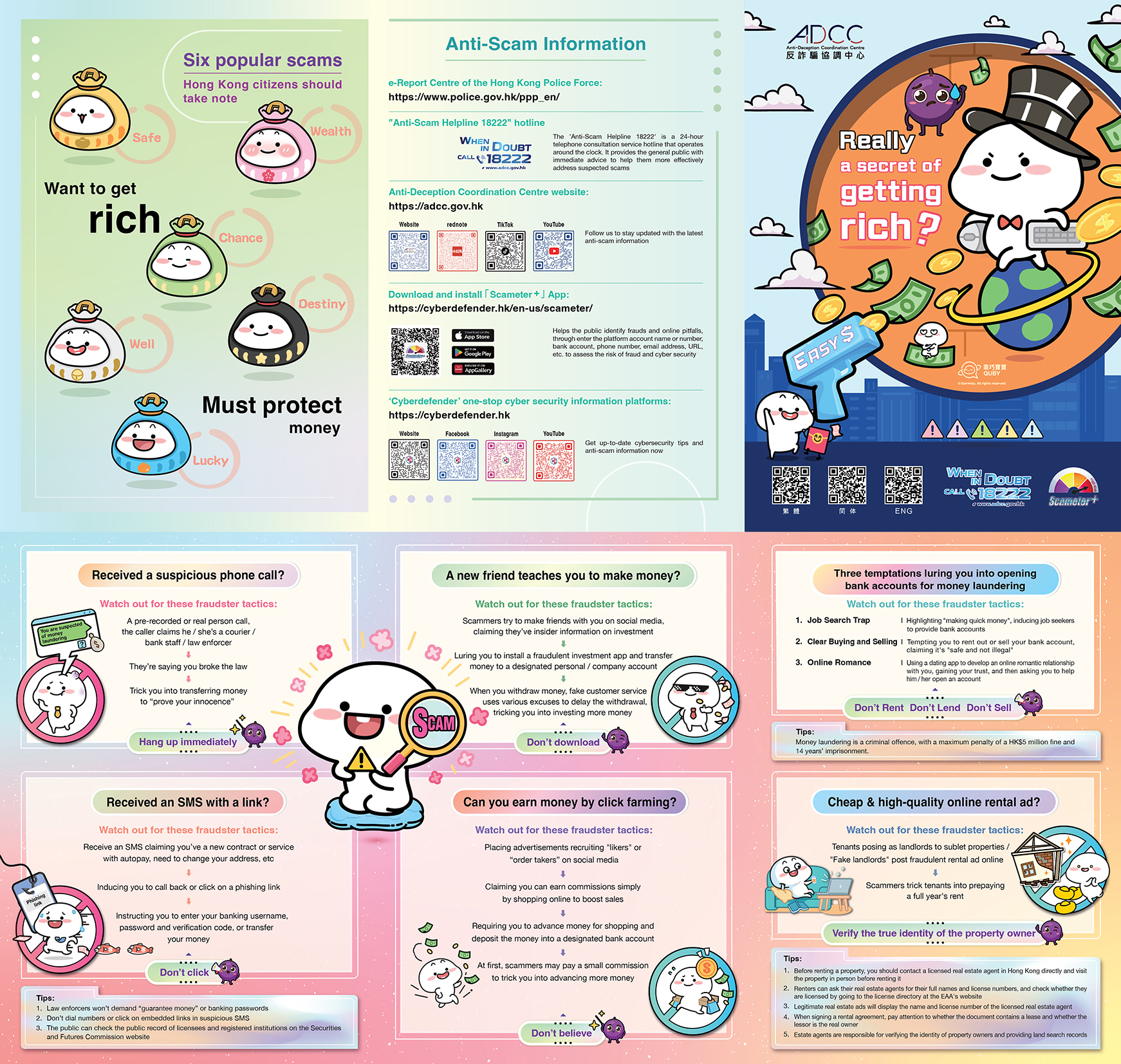 The Anti-Deception Coordination Centre (ADCC) collaborated with the popular Mainland IP “Quby” to launch a brand new WhatsApp and WeChat “Anti-Scam Sticker Pack”. This sticker pack includes 20 lively and fun stickers, featuring playful interactions between Quby and the police mascot “The Little Grape”. Suitable for daily chats, the stickers incorporate multiple anti-scam messages, making it easy for the public to forward and share them. Through this relatable design, the ADCC hopes to further enhance public awareness of scam prevention.Download and use the stickers now! Let’s build a wonderful and scam-free life together!