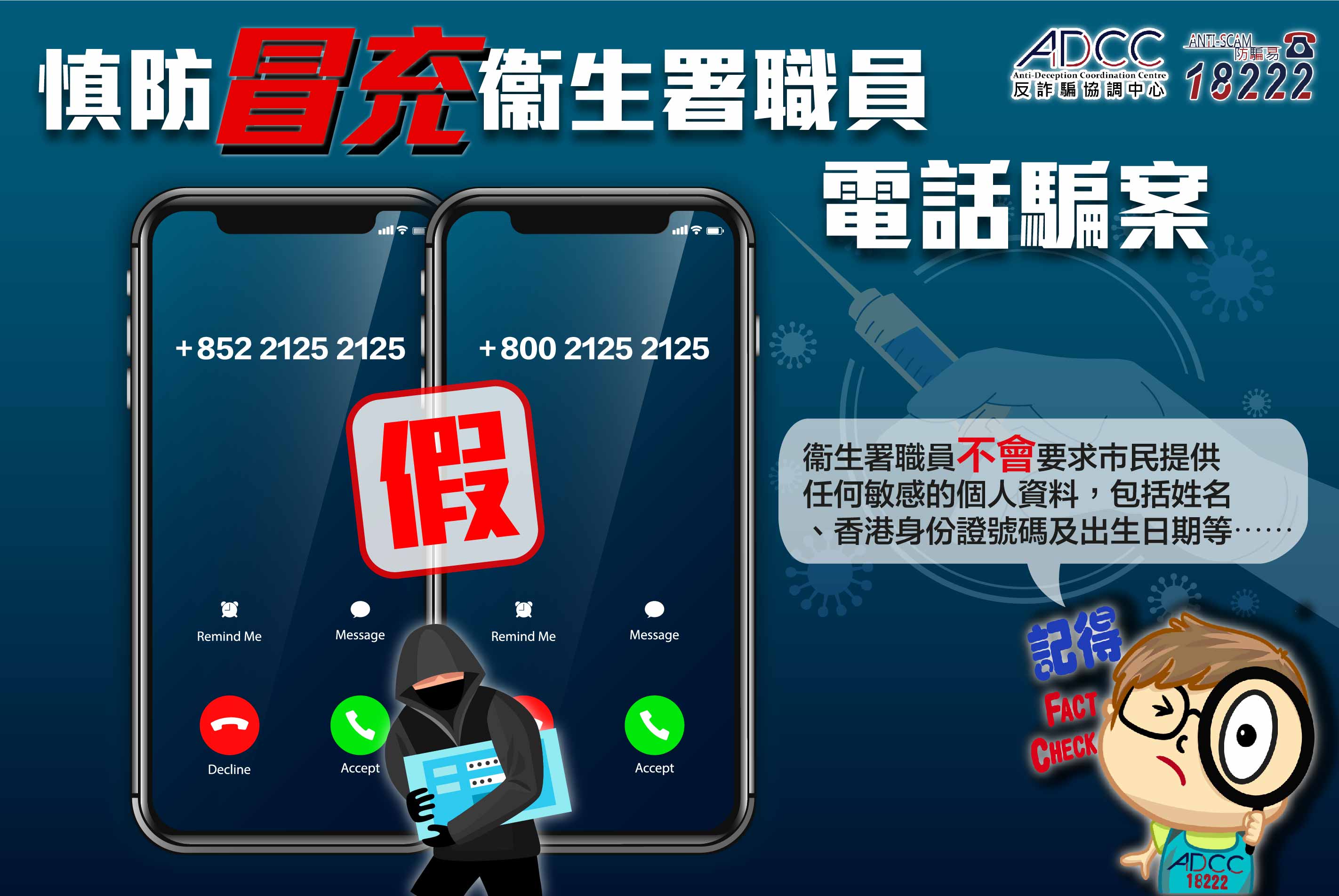 近日有市民报称收到来电显示为「+852 2125 2125」或「+800 2125 2125」的电话,冒充卫生署疫苗接种计划查询电话(2125 2125)。该伪冒卫生署职员利用预录语音来电,讹称市民于较早前接种第一及第二针新冠疫苗时登记的个人资料记录有误,因此未能接种第三针。电话随后转驳至另一名假冒内地执法人员的骗徒,意图骗取其个人资料( 包括姓名、香港身份证号码及出生日期等)。