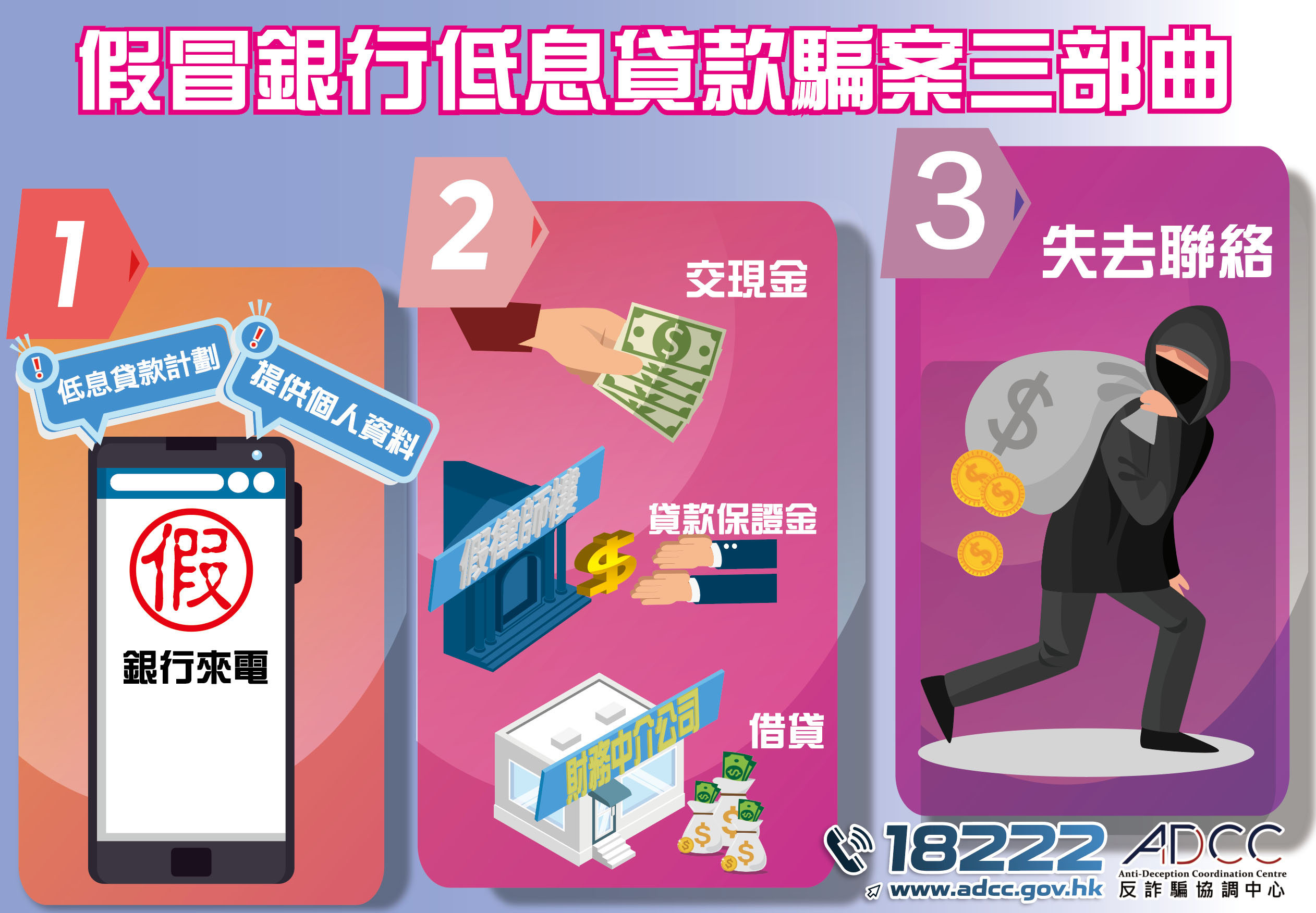 近日有市民收到假冒某本地银行职员的可疑即时消息或真人致电,声称提供低息贷款银行计划,诱骗受害人提供个人银行户口数据、住址证明及入息证明。 其后,骗徒相约受害人前往假律师楼或其他公众地方见面,诱骗受害人交出现金或存入款项到指定户口作贷款保证金,或误导受害人向其他财务公司借贷,随之失去联络。其后受害人向该银行真实职员查询,方知受骗。