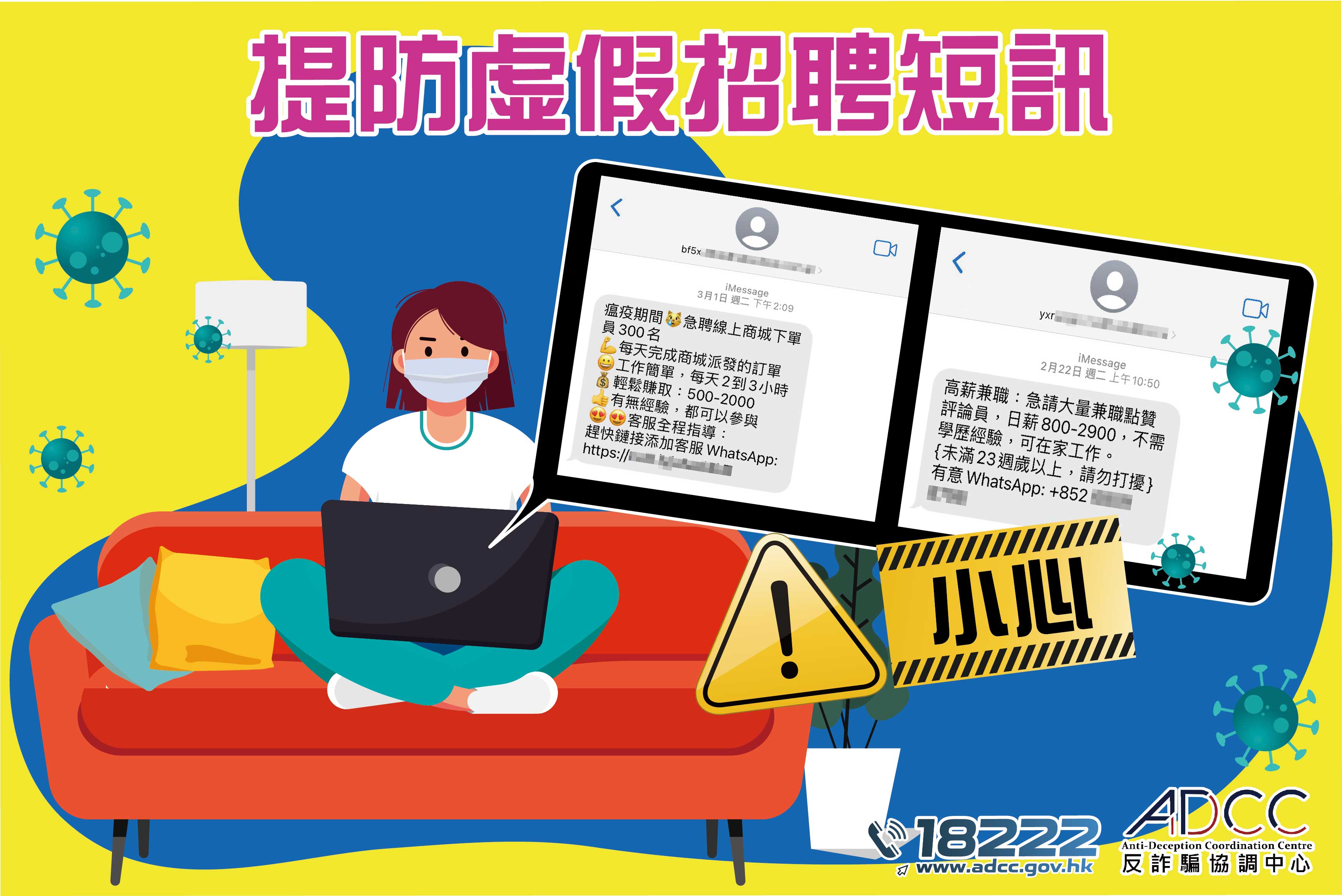 疫情下经济受创,骗徒看准求职者急于寻找兼职帮补收入的心理,向广大市民埋手。近日,反诈骗协调中心发现骗徒透过手机短讯(SMS)、社交媒体或实时通讯软件,向市民发放虚假招聘广告。