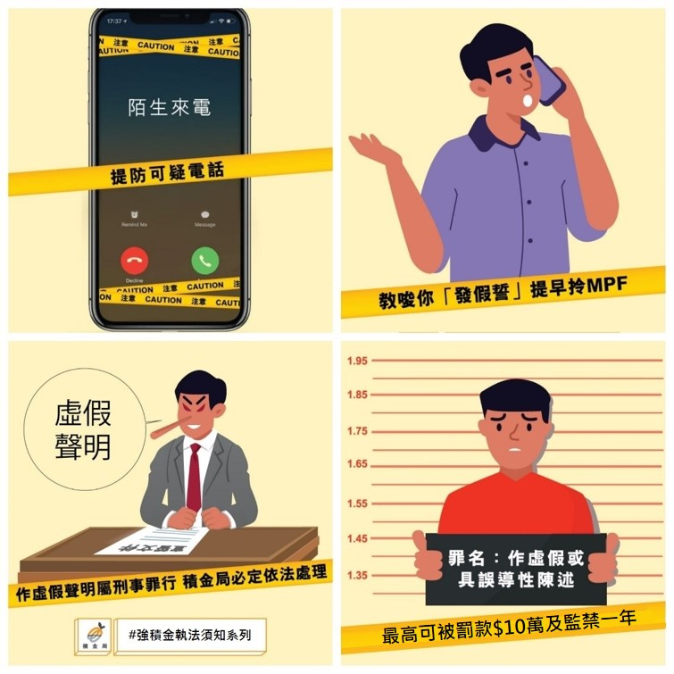 如欲了解更多有关强积金的事宜(包括作出虚假陈述以提早提取强积金属违法行为),市民可浏览积金局网站「执法提示」一栏(https://www.mpfa.org.hk/enforcement/enforcement-alerts#anchor5)。此外,市民亦可观看《警讯》的模拟短片(https://www.youtube.com/watch?v=mz5tXvIay2w),以了解骗徒手法。