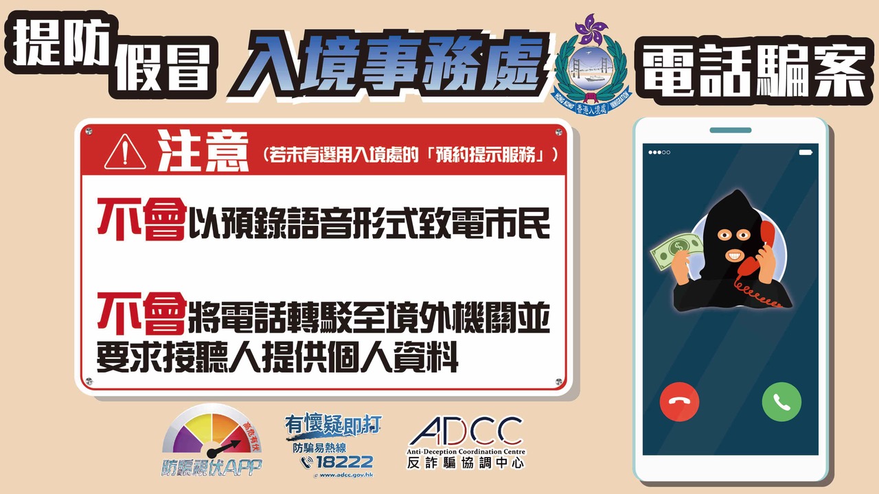 近日,有骗徒假冒入境事务处(入境处)人员致电市民,在对话中主动向他们提供现职入境处人员的姓名、职衔、联络方式及办事处地址等,并着他们可亲身前往该办事处或致电查证其身分,以增加其可信性。