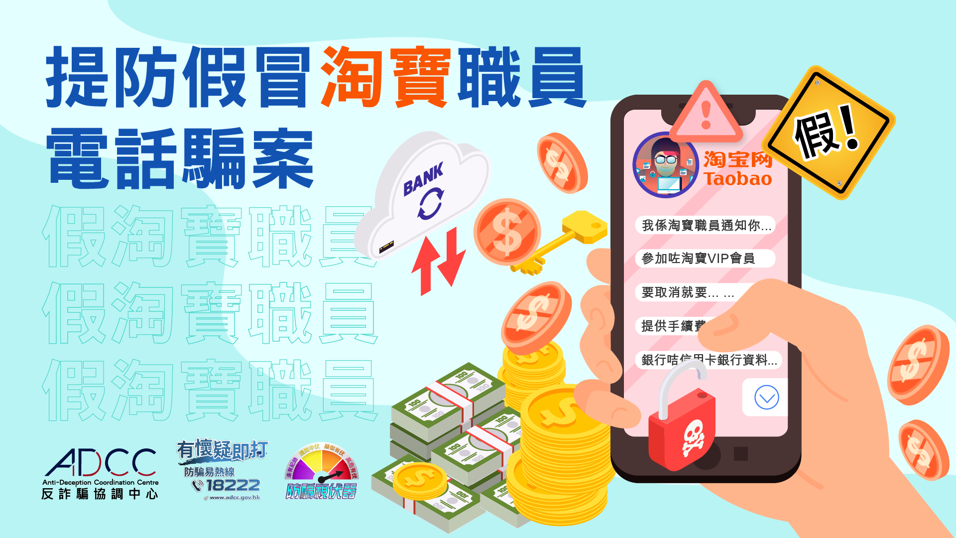 近日,警方收到市民报案,指收到自称淘宝职员的骗徒来电,讹称市民已成为淘宝的VIP会员,如需取消有关会籍,市民需缴交手续费。骗徒其后诱使受害人交出银行卡及信用卡资料,并讹称受害人户口会被冻结,指示受害人把户口存款转账至指定户口,令受害人损失金钱。