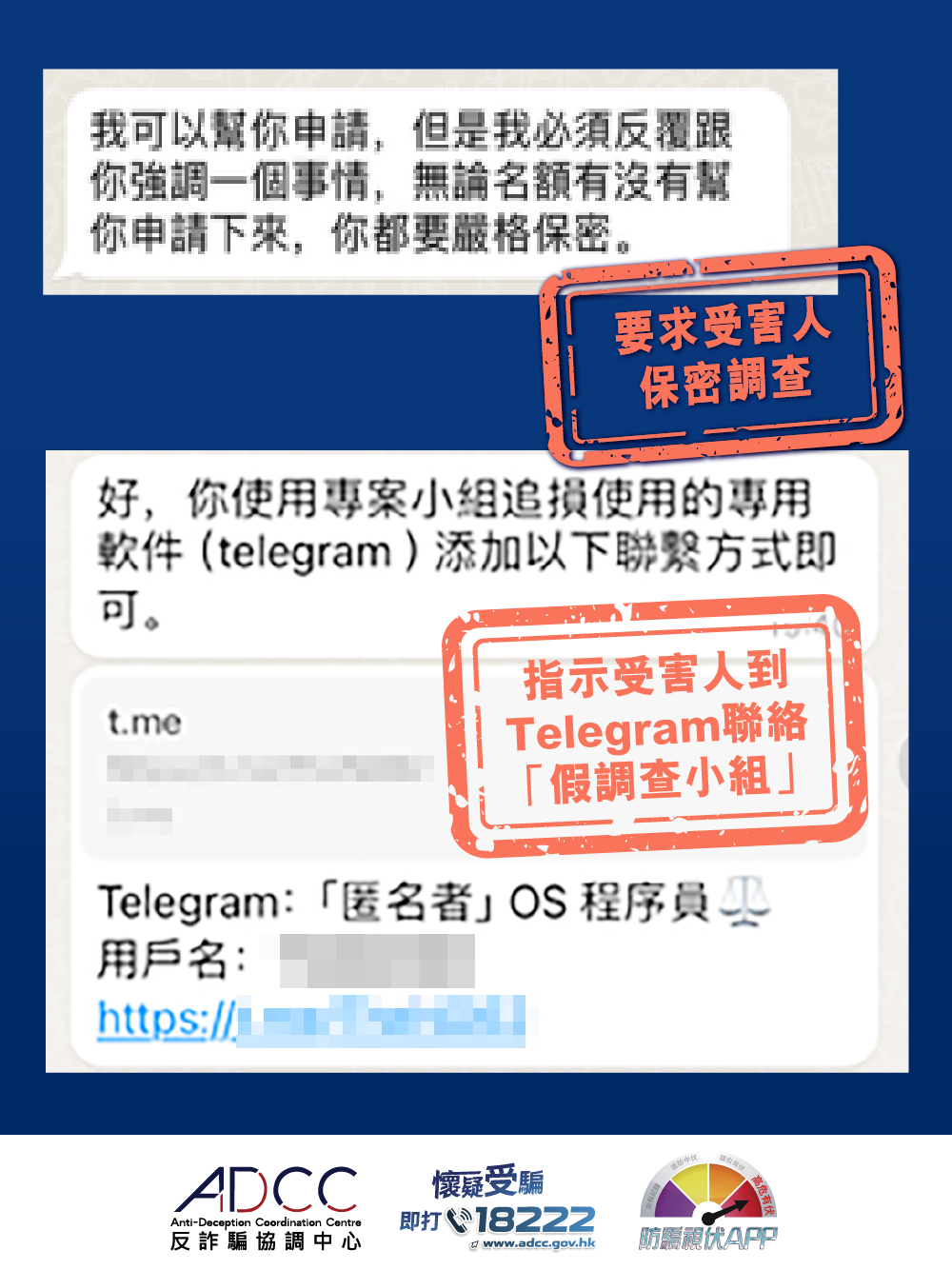 假律师先以WhatsApp向受害人发送伪冒执业证书及名片图像,以骗取受害人信任。及后,假律师更发送虚假文件及图像,讹称反诈骗协调中心的高级警务人员已成立调查工作组,指示受害人转用Telegram 联络假调查员以跟进案件,并要求受害人保密。骗徒其后多次要求受害人将保证金转账到指定银行账户,令受害人蒙受二次金钱损失。