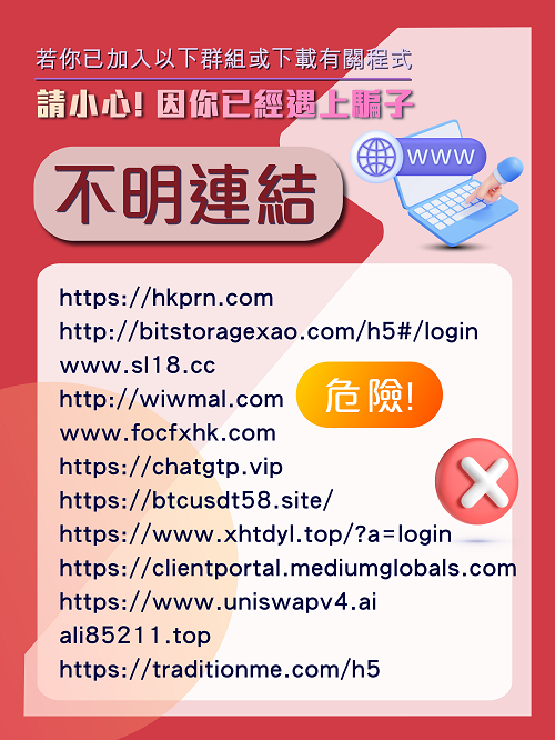 切勿随意点击可疑短讯、电邮或网页内的超链接,以登入任何网站或下载附件;