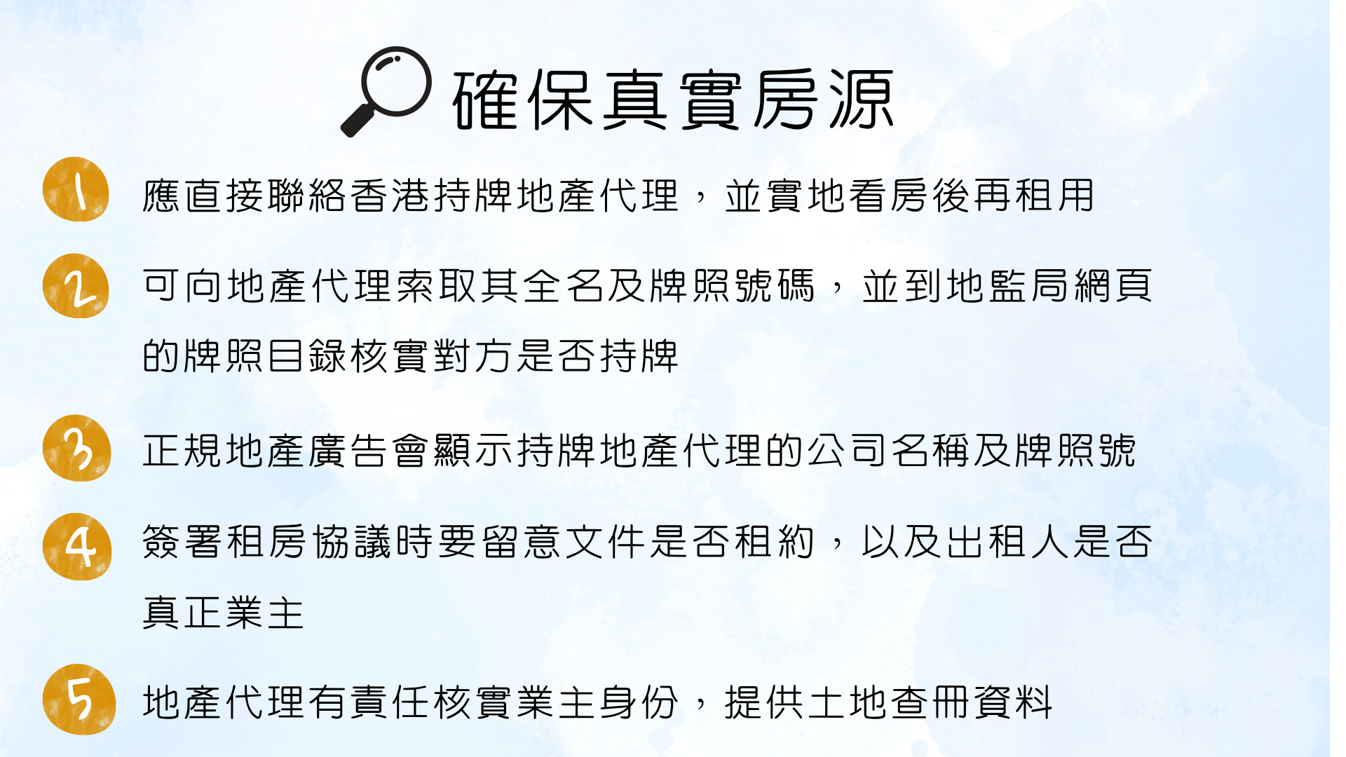 向地产代理索取其全名及牌照号码,并查看地产代理监管局网站的牌照目录,以核实对方是否持牌代理