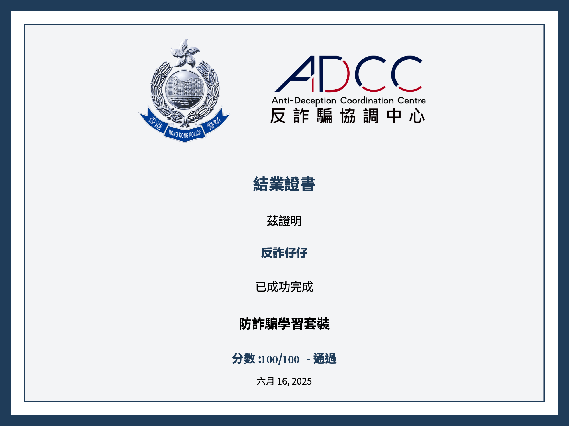 香港警务处反诈骗协调中心制作此网上学习套件,内容包含反诈影片、真实案例、测试题目、电子证书,涵盖时下流行的电信诈骗、投资诈骗、购物诈骗、情缘诈骗、求职诈骗的手法,并提供适切防范建议,以期提高公众防骗意识。