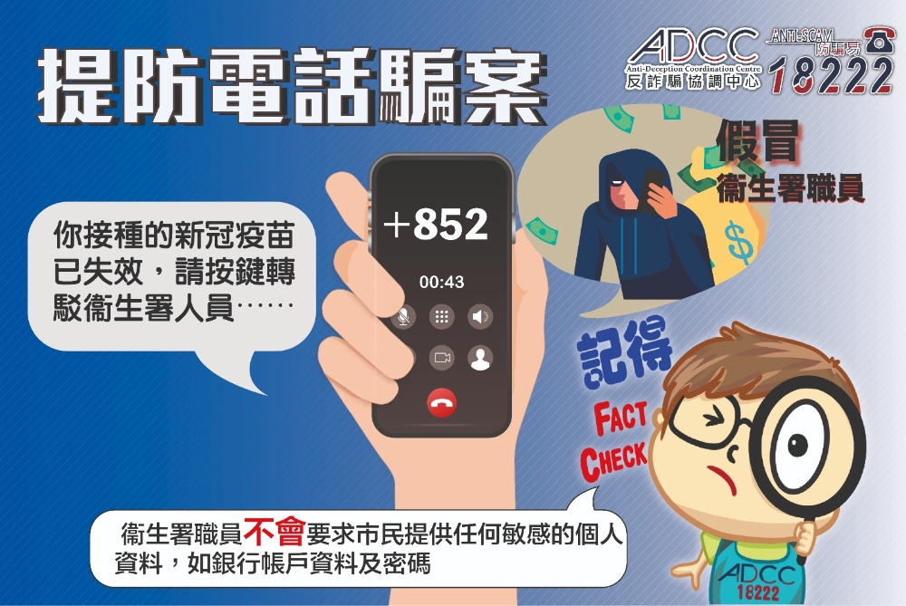 最近,警方接獲市民查詢有關「+852」字頭,假冒香港衞生署職員的來電,聲稱市民已接種的新冠疫苗經已失效,電話隨後轉駁至另一名假冒內地執法人員的騙徒,意圖騙取其個人及銀行帳戶資料、密碼。