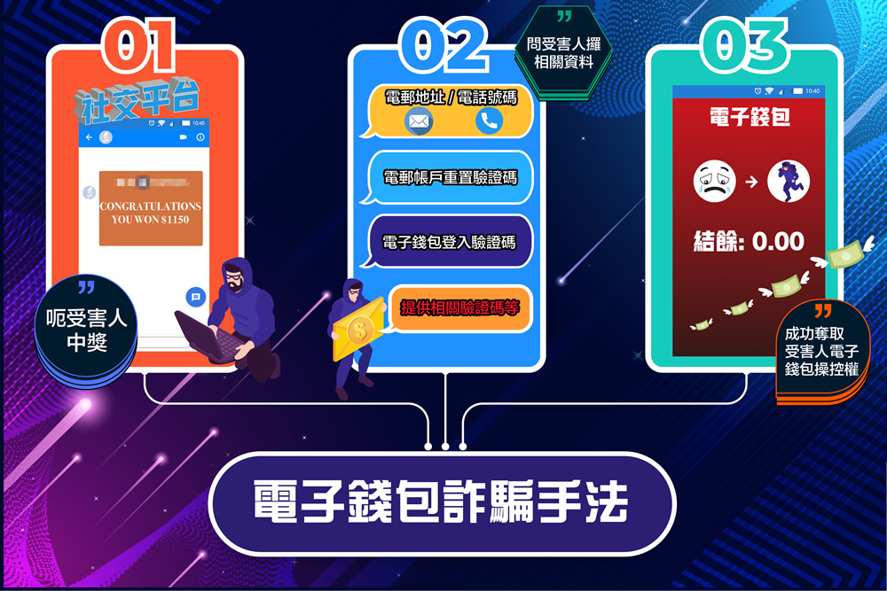 - 從而完全操控受害人電子錢包及電郵帳戶,將電子錢包內的款項轉走。