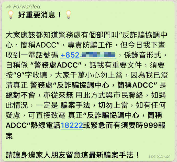 情報顯示,自本月28日開始,有多個不同的電話號碼,皆以+852為字頭,假冒香港警務處(包括反詐騙協調中心)企圖詐騙,訛稱事主有重要文件或被通緝等等,藉此進行詐騙。