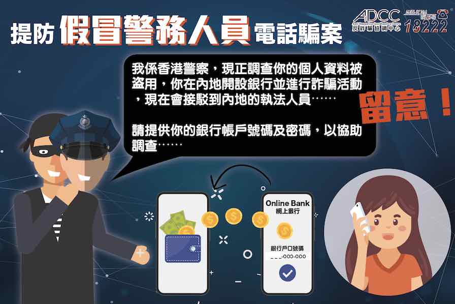 最近,警方收到受害人舉報,指收到偽冒香港警察的來電。騙徒操流利純正廣東話,表示正協助內地執法人員調查案件,並指受害人的個人資料被盜用及於內地開立銀行帳戶。電話隨後接駁到另一假冒內地執法人員的騙徒,後者恐嚇受害人在內地干犯詐騙案件,以騙取受害人的網上銀行帳戶號碼及密碼。其後,受害人發現帳戶裡的存款被轉走才意識受騙。