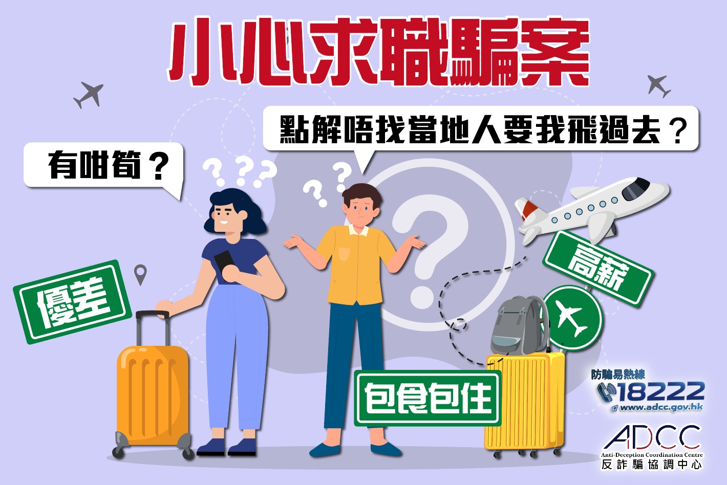 近日,有媒體報導懷疑有香港居民被誘騙到東南亞國家從事非法工作。警方高度重視有關事件,正積極跟進求助個案。針對網上求職騙案,警方作出以下呼籲: