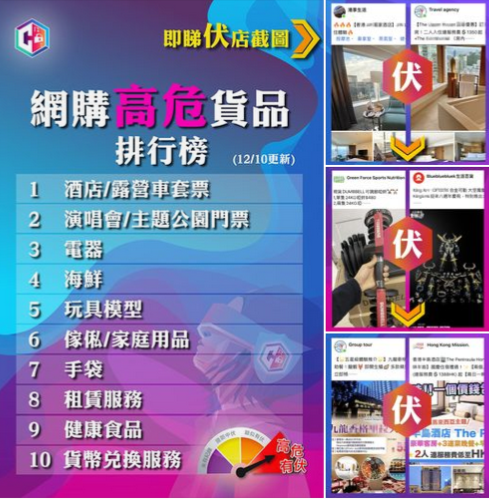 近日,警方接獲市民求助,指透過社交媒體向網上賣家大量購入一位知名本地歌手的演唱會門票,但轉賬後無法聯絡賣家。受害人最後蒙受二十多萬元損失。網上購物雖然為市民帶來便利,但亦危機四伏。警方根據近日接獲的網購騙案舉報,整理出以上「網購高危貨品排行榜」,希望市民多加留意。