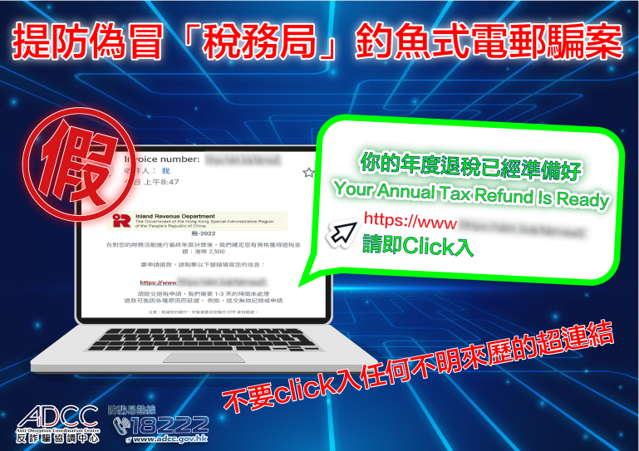 近日,有騙徒偽冒「稅務局」向市民發出標題為「HK-Refund-Online-Confirmation」的釣魚式詐騙電郵。電郵內附超連結連接另一網站,企圖套取市民的個人及信用卡資料。