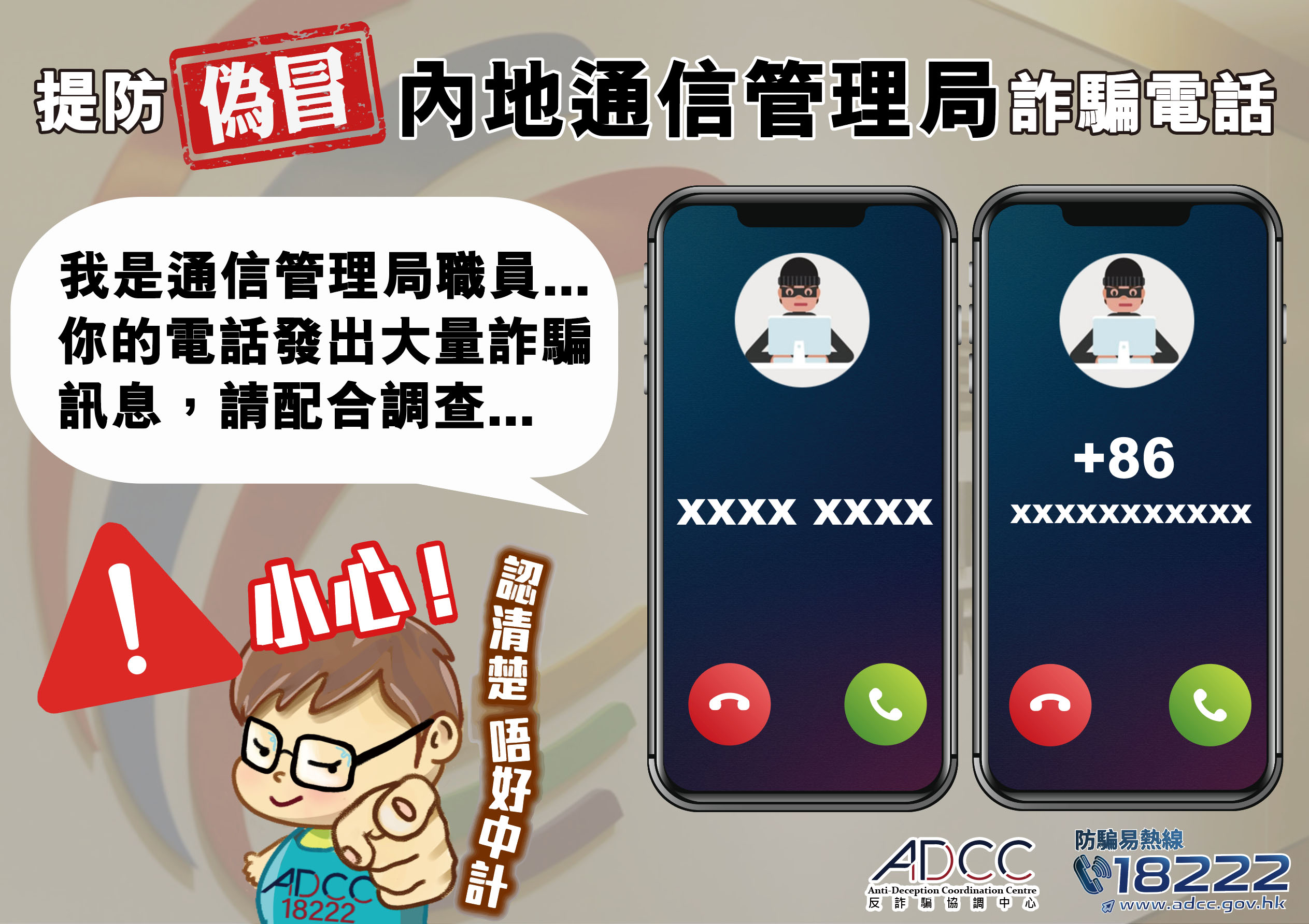 - 如收到聲稱中國內地電信管理局職員來電,應提高警覺,切勿輕信;