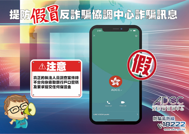 近日,有騙徒假冒反詐騙協調中心人員,在即時通訊軟件“LINE”以本中心的英文簡稱“ADCC”向市民發出訊息,意圖騙取市民的個人資料、銀行賬戶資料及密碼。