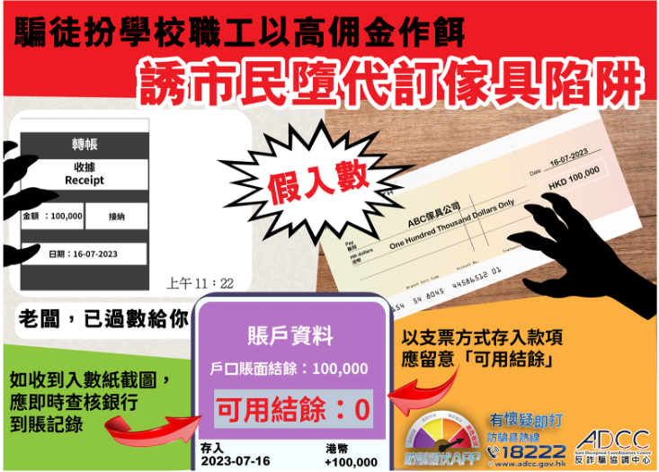 近日,有騙徒假扮學校或公司員工致電市民,以不同理由利誘市民代其向指定供應商訂購傢具。騙徒答應受害人除貨款外,亦會支付一筆可觀佣金作為中間人費用。