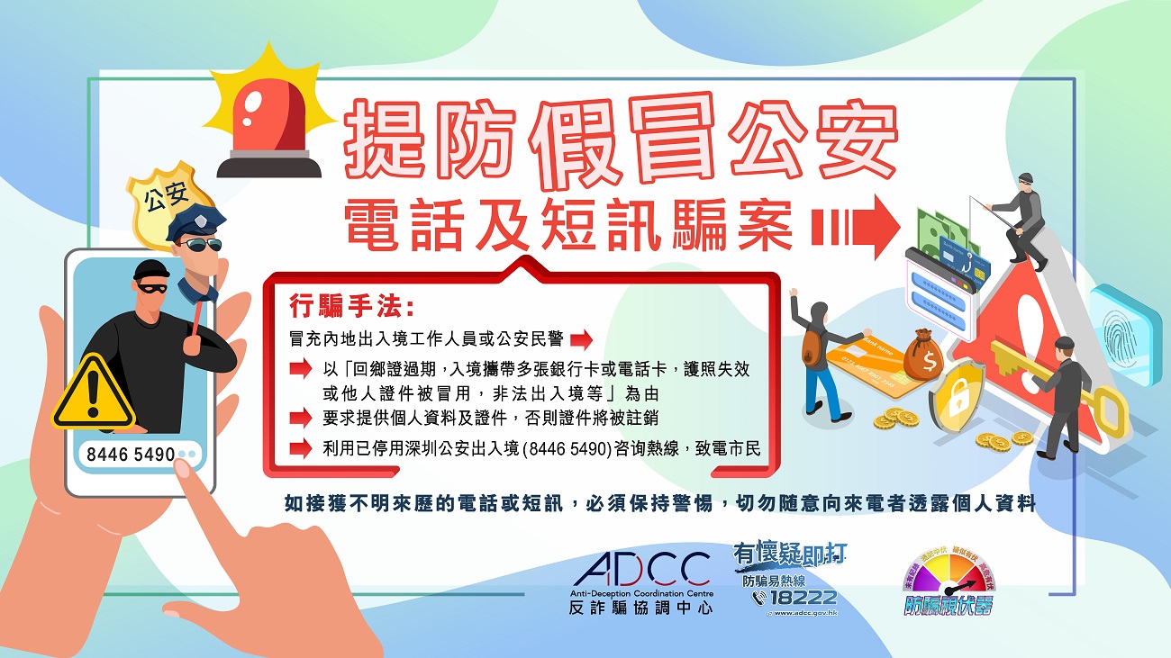 近日,有市民收到假冒中國內地出入境工作人員或公安民警的來電或短訊(聲稱由8446 5490發出),以「回鄉卡過期、攜帶多張銀行卡或電話卡入境、護照失效或冒用他人證件、非法出入境」等為由,要求市民提供個人資料及證件以協助調查。