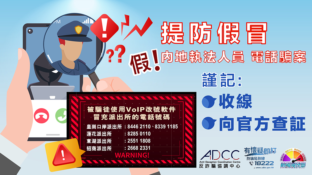 警方提醒,騙徒會以VoIP改號技術更改來電顯示號碼,假冒中國內地執法機關致電市民,市民應小心提防。