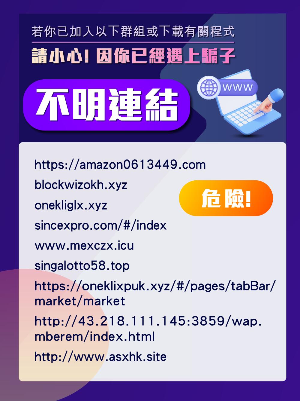 切勿隨意點擊可疑短訊、電郵或網頁內的超連結,以登入任何網站或下載附件;