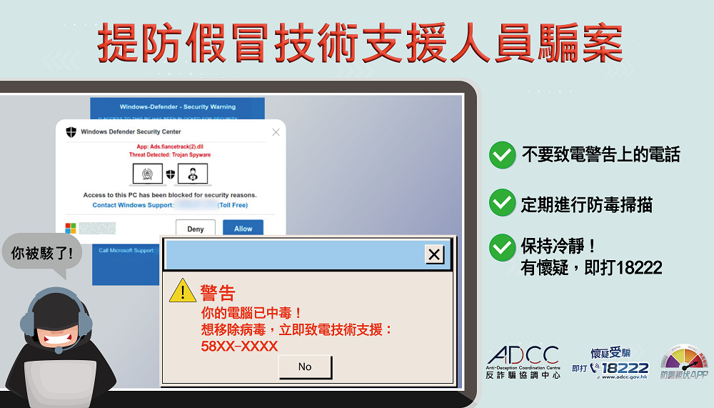 近日接獲市民舉報,受害人在電腦收到彈出視窗,訛稱其電腦遭到入侵,並誘導受害人撥打「技術支援熱線」。冒充「熱線職員」的騙徒聲稱受害人的電腦遭到駭客入侵,訛稱能為受害人解決「問題」並要求付款; 或要求受害人安裝應用程式,讓騙徒遙距控制受害人的裝置,並套取受害人戶口資料,例如銀行卡號碼和短訊驗證碼,從而盜取銀行戶口款項。