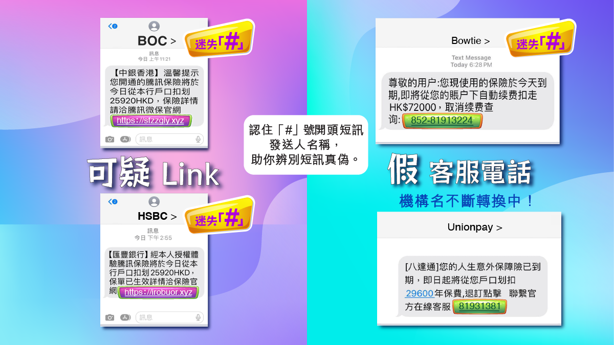 切勿輕易相信任何自稱銀行、支付平台或保險公司職員的來電或訊息。不要向陌生人透露任何個人資料、網上理財用戶名稱、密碼、驗證碼或信用卡資料。