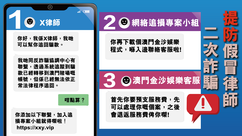 其後雙方以WhatsApp溝通。假律師向受害人表示已聯繫反詐騙協調中心,追蹤到相關騙款已經轉移到澳門金沙娛樂場並被清洗,無法以正常法規追回。假律師建議受害人加入「網絡追損專案小組」的即時通訊群組並依照指示下載「澳門金沙娛樂」應用程式,以便追蹤騙款流向,從而追討其損失。受害人其後依照假客戶服務部的要求,將款項轉帳到指定銀行帳戶以作服務費,最終蒙受二次金錢損失。