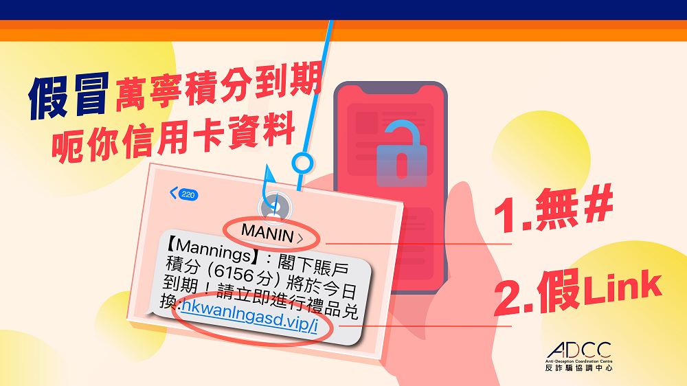 騙徒偽冒萬寧隨機向市民發出釣魚式欺詐短訊(SMS),訛稱客戶積分即將到期,誘使市民點擊連結,登入虛假網站以低廉價格換購禮品,藉此套取信用卡資料。市民最終蒙受金錢損失。