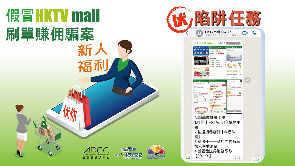近日,有騙徒假冒HKTVmall隨機將市民新增至WhatsApp群組。部分騙徒聲稱市民只要收藏產品,再以截圖作證明就可以獲取酬勞。該等騙徒會要求受害人瀏覽偽冒釣魚網站或下載假應用程式,然後作登記,以騙取受害人的個人資料。亦有騙徒要求市民墊支刷單,在HKTVmall將貨品放入購物車後傳送截圖予騙徒,再指示受害人將貨款存入指定個人帳戶。初時,騙徒會兌現承諾,將貨款及佣金匯給受害人,令受害人信以為真。因此,受害人墊支更多金錢,以作更大額的購物,但騙徒在取得款項後已逃之夭夭。