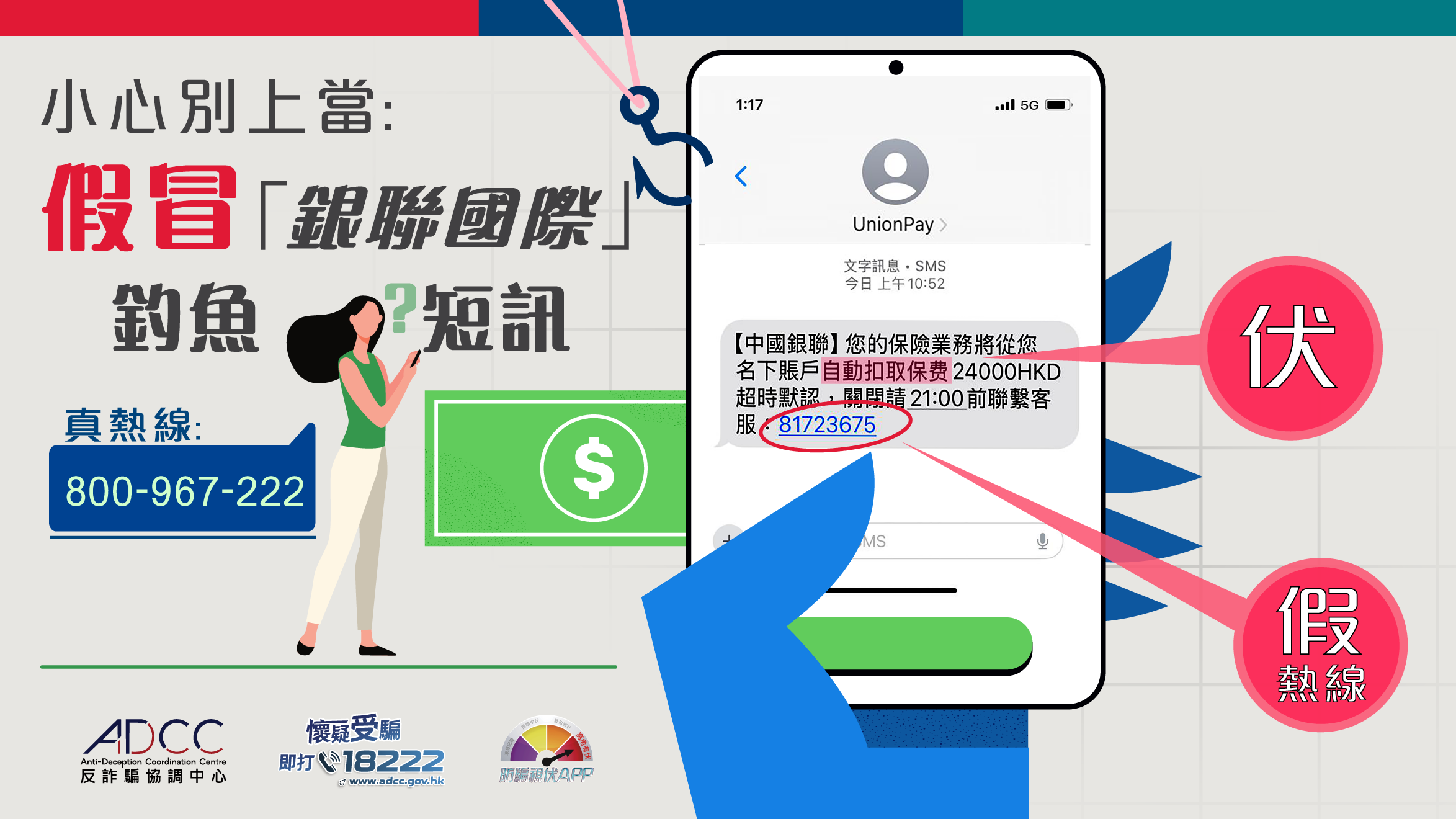 近日有騙徒假冒銀聯國際職員,以「UnionPay」名稱向市民發送釣魚短訊,訛稱其中國銀聯的帳戶將被自動扣款以支付保險費用,並且附上虛假熱線8172 3675引誘市民回撥。騙徒訛稱是保險公司職員,可以協助取消扣款,再指示市民進入偽冒的銀聯網站,目的是騙取個人及銀行帳戶資料,甚至騙取金錢。