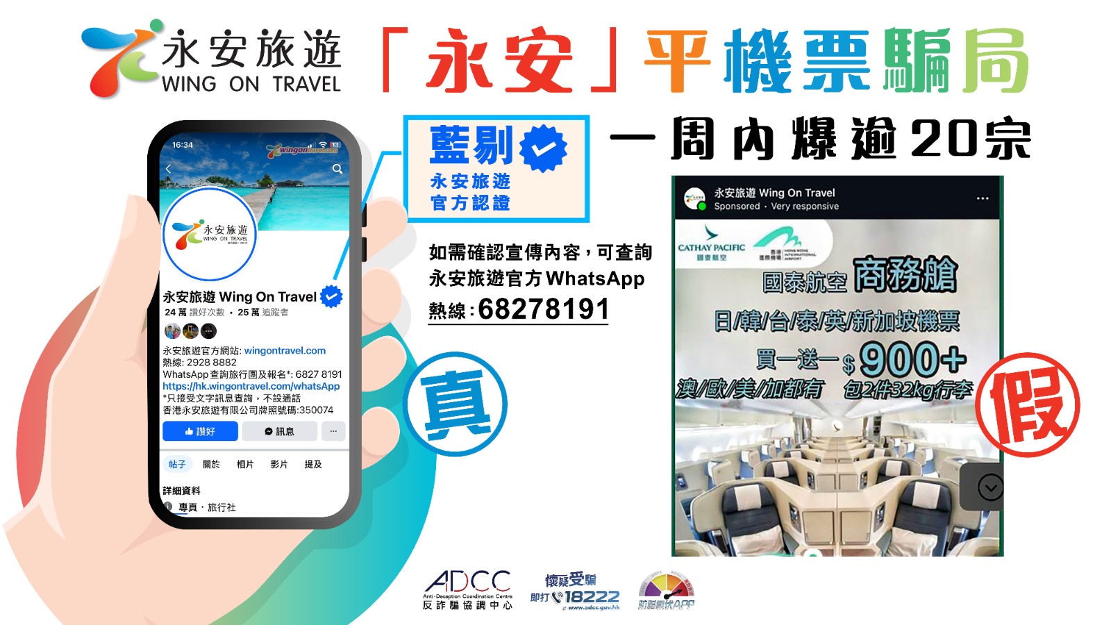 城中名人也中伏!有騙徒假冒永安旅遊職員在Facebook、Instagram等社交平台發放廣告,聲稱提供往返日本、韓國、台灣、英國、美國、歐洲、澳洲等地的商務艙機票買一送一優惠。有受害人點擊超連結,直接經WhatsApp查詢,隨後被誘使轉帳至指定銀行戶口。警方一周內接獲逾20宗相關報案,最高損失達10萬元,總損失超過42萬元。