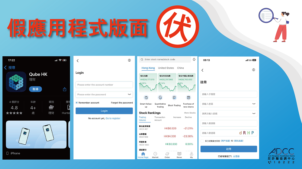 引誘轉帳:要求受害者下載投資App「Qube HK」,並轉帳至指定帳戶。