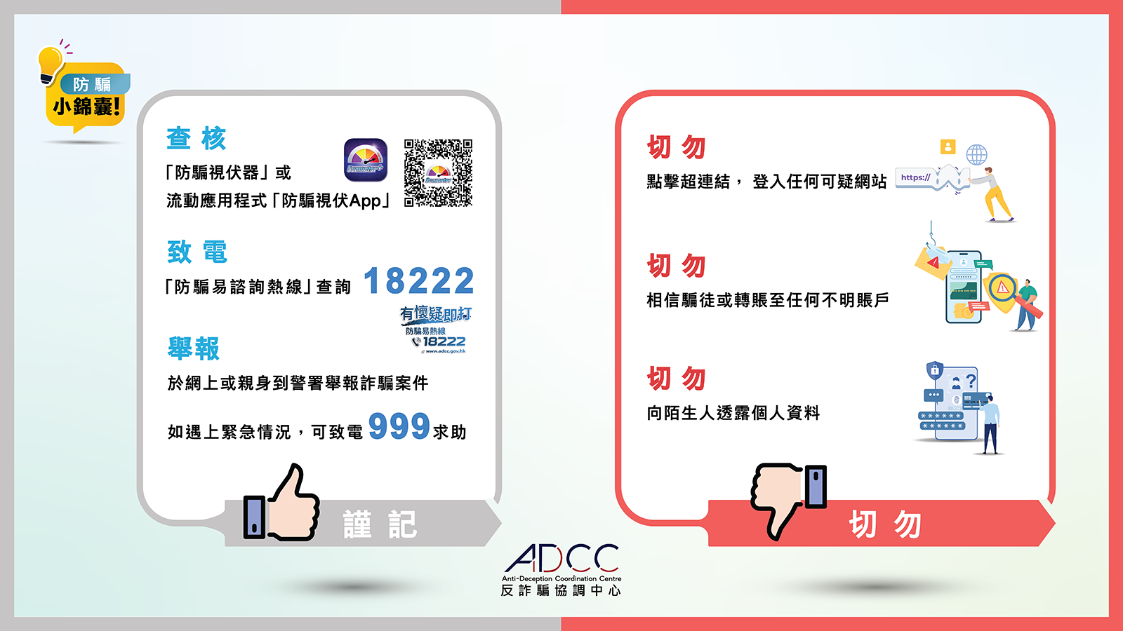 此外,警務人員和銀行職員在任何情況下均不會要求市民披露個人資料或銀行認證資料,更不會要求市民轉移款項到任何賬戶。如市民對來電者的身分有懷疑,可致電「防騙易18222」熱線與協調中心聯絡,或主動向相關機構查證,以核實來電者的身分。
